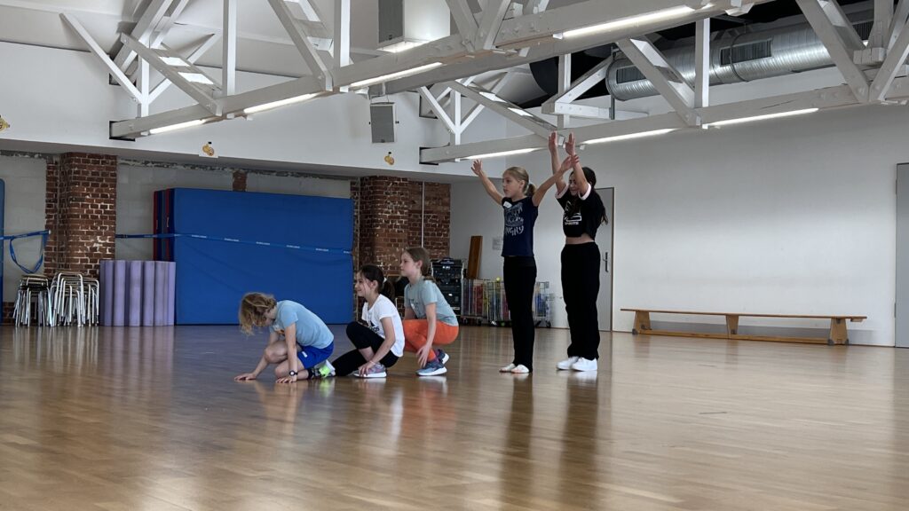 Anschließend ging es in die kreative Phase: In Fünfergruppen entwickelten die Kinder innerhalb einer Stunde ihre eigene Choreografie. Dabei waren ihrer Fantasie keine Grenzen gesetzt – ob Elemente aus den Workshops, eigene Schritte oder ein Mix aus allen Tanzstilen – alles war erlaubt. Besonders im Vordergrund stand dabei das faire Miteinander, gegenseitige Unterstützung und gemeinsamer Spaß am Tanzen.